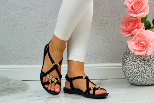 Damskie sandały w kolorze czarnym na płaskim spodzie. Sprawdzą się zarówno jako obuwie na co dzień w letnie, upalne dni oraz jako obuwie na specjalne okazje. Prosty fason dopasuje się wielu stylizacji a ozdobne koraliki dodadzą uroku każdej z nich. Elastyczny pasek przy pięcie ułatwia zakładanie obuwia oraz dopasowanie do stopy.