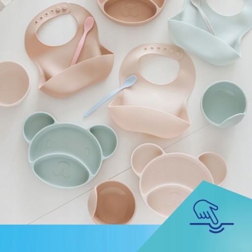 Talerz ma antypoślizgową przyssawkę, która zapobiega niekontrolowanemu przemieszczaniu się naczynia po powierzchni stołu lub blatu krzesełka do karmienia, uniemożliwia wywrócenie naczynia lub zrzucenie w całości na podłogę. Talerzyk trójdzielny z przyssawką został wykonany w 100% z wysokiej jakości silikonu przeznaczonego do kontaktu z żywnością.