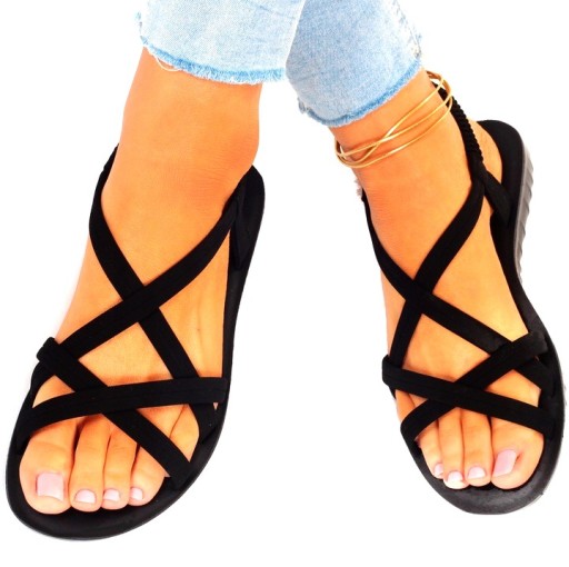 Damskie sandałki w kolorze czarnym na płaskim spodzie. Idealnie sprawdzą się jako obuwie na co dzień w letnie, upalne dni. Prosty fason dopasuje się również do eleganckich stylizacji a ozdobne kryształki dodadzą uroku niejednej stylizacji. Elastyczny pasek przy pięcie ułatwia zakładanie obuwia i ułatwia jego dopasowanie do stopy.
