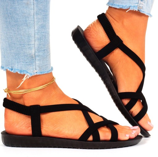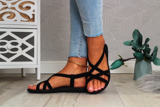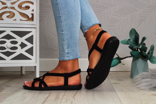 Damskie sandały w kolorze czarnym na płaskim spodzie. Sprawdzą się zarówno jako obuwie na co dzień w letnie, upalne dni oraz jako obuwie na specjalne okazje. Prosty fason dopasuje się wielu stylizacji. Elastyczny pasek przy pięcie ułatwia zakładanie obuwia oraz dopasowanie do stopy.