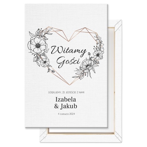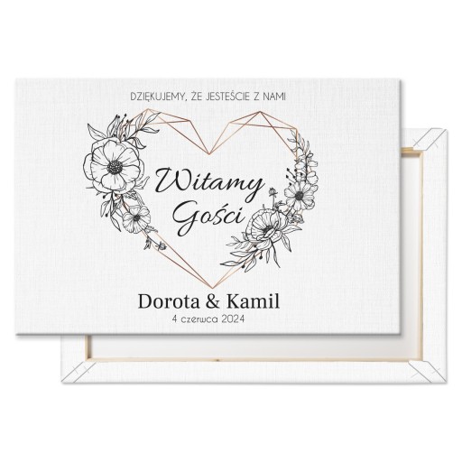 1️⃣ Osobisty akcent: Twoje zdjęcie oraz imiona pary młodej zostaną umieszczone na eleganckim płótnie, nadając niepowtarzalny charakter każdej uroczystości.