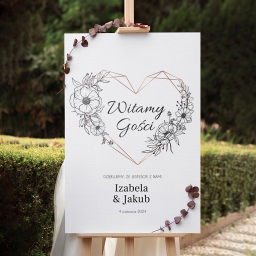 Tablice mają wymiar 40 × 60 cm, co sprawia, że są idealne do wyeksponowania w różnych miejscach na Twoim weselu. Umieść je przy wejściu, na stoliku powitalnym lub nawet na ścianie jako część dekoracji. Stwórz niepowtarzalną tablicę powitalną na swoje wesele już dziś! Wybierz swój ulubiony wzór, dodaj własny tekst i zdjęcie w prostym kreatorze online. To idealny sposób, aby rozpocząć swoje wesele w wyjątkowy sposób!