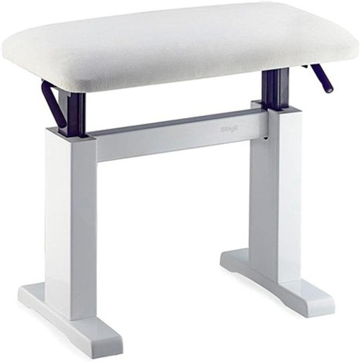 Wysokiej jakości stołek do fortepianu hydrauliczny o nowoczesnym designie. Regulacja wysokości w zakresie od 46,5 do 59 cm, siedzisko wykonane z niepalnego białego winylu o wymiarach 63 x 33 cm. Waga stołka wynosi 13,1 kg, kolor jest biały błyszczący. Krzesło nadaje się do produkcji koncertowych i ćwiczeń domowych.