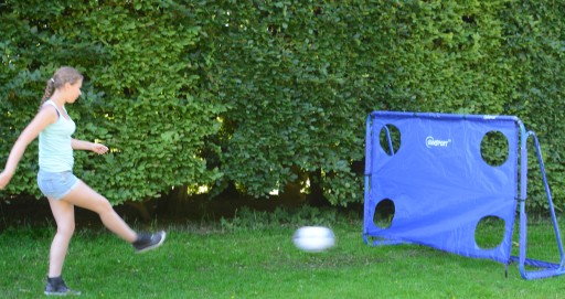 Ta szeroka na 2 metry bramka doskonale nadaje się do ogrodu i można ją łatwo przenieść, gdy trzeba skosić trawę, lub postawić na ulicy, gdy nadejdzie czas, by cała okolica zmierzyła się w meczu piłki nożnej. Rama jest wykonana z malowanej na niebiesko stali o średnicy rurki 38 mm. Do bramki dołączona jest płachta do celowania, za pomocą której można ćwiczyć technikę rzutów rożnych. Gdy zabierasz bramkę do domku letniskowego lub przechowujesz ją w garażu przez zimę, zajmuje ona niewiele miejsca w dołączonej wytrzymałej torbie do przechowywania.