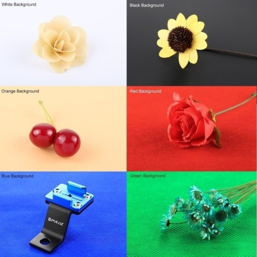 - tła fotograficzne x6 (czarne, białe, pomarańczowe, zielone, czerwone, niebieskie)