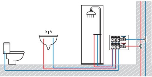 Każdy pojedynczy punkt jest zasilany bezpośrednio rurą z rozdzielacza, bez żadnych złączek pomiędzy danym punktem a rozdzielaczem.