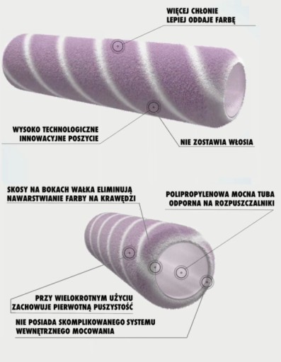 - skosy na bokach wałka eliminują nawarstwianie farby na krawędzi.