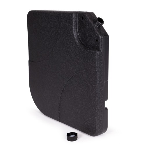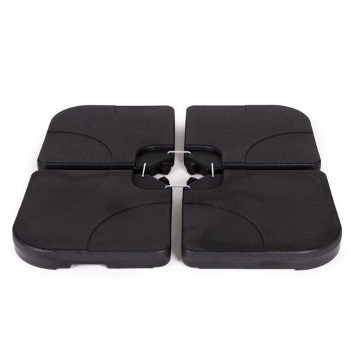 W każdym z 4 elementów podstawy znajduje się odkręcany korek, po jego wykręceniu należy napełnić podstawę wodą. Wypełniony wodą panel pomieści do 15 l, całość obciążenia po wypełnieniu osiąga wagę ok 60kg, co pozwoli utrzymać nawet duży parasol.