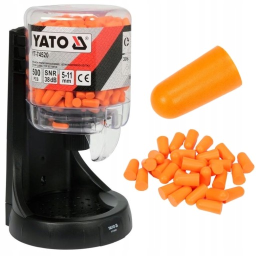 Dozownik YT-74520 z zatyczkami przeciwhałasowymi. Jednorazowe zatyczki do uszu wykonane z wolno rozprężającej się miękkiej pianki poliuretanowej. Po włożeniu do ucha i rozprężeniu są niemal niewyczuwalne. Charakteryzują się jedną z najwyższych w swojej klasie wartością tłumienia. Dyspenser można postawić na stole lub powiesić na ścianie. Przekręcenie pokrętła dyspensera dozuje wkładki na ręce użytkownika.