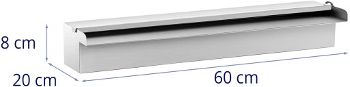 Wylewka wodospadowa marki UNIPRODO idealnie nadaje się jako relaksująca ozdoba w ogrodzie, na tarasie czy w basenie. Woda z wylewki o długości 60 cm zapewnia równomierny przepływ wody, a ekonomiczne światło LED tworzy wizualne akcenty, zużywając zaledwie 24 W. Oświetlenie jest chronione przed bryzgającą wodą ze wszystkich stron dzięki klasie ochrony IP44. Diody LED w kolorze białym i niebieskim są zintegrowane i estetyczne, dodają efekt wizualny. Wylewka została wykonana ze stabilnej i odpornej na korozję stali nierdzewnej, która chroni przed uszkodzeniami spowodowanymi przez słoną lub chlorowana wodę. Urządzenie wymaga minimalnej konserwacji i cechuje się żywotnością.