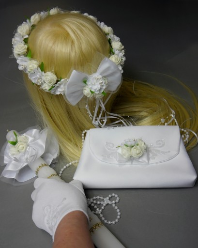 Torebka komunijna satynowa prostokątna z trzech warstw tkaniny ( satyny ślubnej, sztywnego tiulu i tkaniny cambel) z koronkową delikatnie mieniącą się aplikacją oraz przypinką z kwiatków piankowych i satynowych.Torebka posiada sztywną wkładkę pomagającą w zachowaniu kształtu. Na pozostałych aukcjach można do niej dopasować okapnik rękawiczki oraz wianek. Produkt Polski.