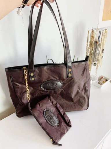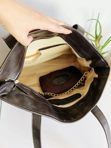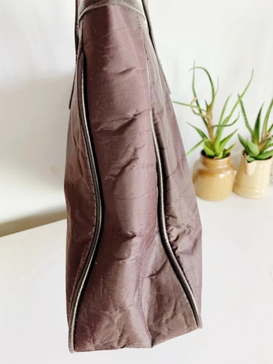 Duża, pojemna torba wykonana z połączenia elementów skórzanych i wykonanych ze śliskiego materiału. Logowana na złotych elementach i z przodu. Dno usztywniane, wewnątrz kilka kieszonek, jedna zapinana na zamek + dołączona dodatkowa saszetka na łańcuszku. Wady: pęknięcie materiału w jednym miejscu widoczne na zdjęciu (wygląda jak rysa/zaciągnięcie, nie jest to dziura), niewielkie zagniecenia.