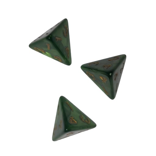 Komplet dwudziestu pięciu kości czterościennych. Niezwykle wysoka jakość odlewu, precyzja żłobienia oraz malowania numerów czynią z nich podstawowy wybór dla wielu graczy, zarówno początkujących, jak i zaawansowanych.