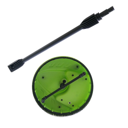 Szczotka posiada ramię obrotowe z dwiema dyszami ciśnieniowymi które dzięki swoim rozmiarom i skuteczności czyszczenia jest w stanie zwiększyć wydajność powierzchniową myjki nawet o 500% w porównaniu do mniejszych szczotek. T-racer posiada w zestawie przedłużkę która zwiększy zasięg szczotki i ułatwi pracę.