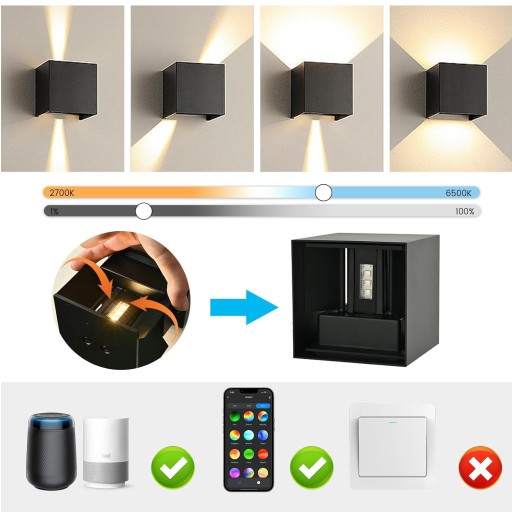 - Ponadto zmieniający kolor inteligentny kinkiet LED może regulować jasność w zakresie od 1% do 100%, aby spełnić Twoje potrzeby w zakresie różnych poziomów jasności.