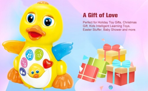 Ta tańcząca kaczka zawiera przycisk start głowy, przycisk efektu dźwiękowego, przycisk głosowy, przycisk czerwonego serca, regulację głośności, przycisk melodii i przycisk utworu.