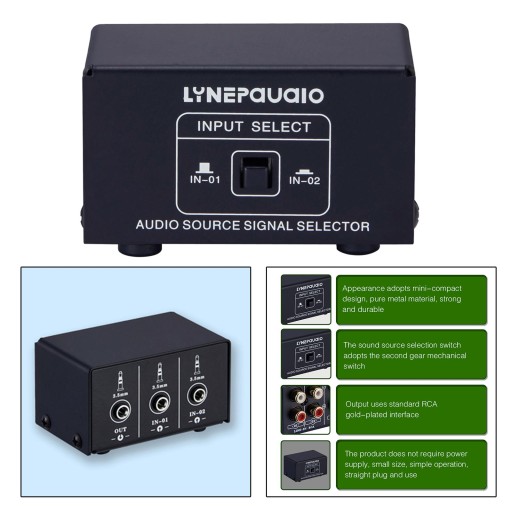 Dwa zestawy przełączników źródła stereo, interfejs urządzenia 3,5 mm dla wejścia i wyjścia, a przełącznik jest obsługiwany z ręcznym przełącznikiem z 2 pozycjami
