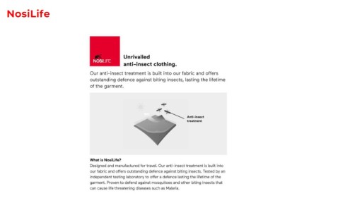 - NosiLife: Owady podczas podróży lub nawet w ogrodzie w domu mogą przenosić wiele chorób. NosiLife odstrasza owady i jednocześnie chroni przed szkodliwym promieniowaniem UV. Materiały zawierają aktywny składnik, który wnika bezpośrednio we włókno i nie ulega wypłukiwaniu. Środek został pierwotnie opracowany do stosowania przeciwko roztoczom i jest używany w szpitalach na całym świecie przeciwko pluskwom w materacach i poduszkach.