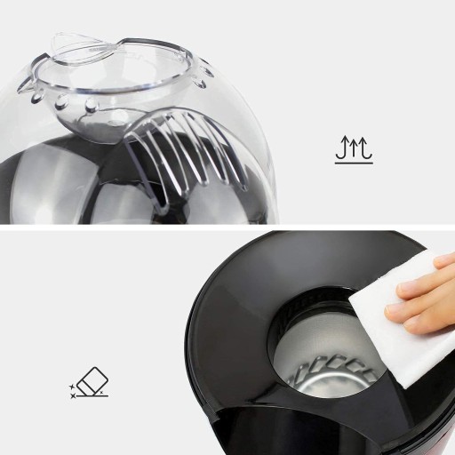 🍿🍿 Przezroczysta obudowa - maszyna do popcornu ma praktyczną przezroczystą obudowę. Pozwala to spojrzeć na maszynę do popcornu bez narażania się na nieoczekiwany wybuch kukurydzy. Kopuła jest ukształtowana w taki sposób, że cały popcorn trafia dokładnie tam, gdzie chcesz. Umieść miskę lub patelnię pod maszyną do popcornu, a popcorn sam do niej wpadnie. Ponieważ nie jest wymagany smar, czyszczenie jest bardzo łatwe.