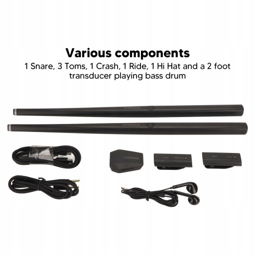 1. Technologia wirtualnej rzeczywistości: Elektroniczny zestaw perkusyjny wykorzystuje technologię wirtualnej rzeczywistości do symulacji dźwięku różnych elementów zestawu perkusyjnego, w tym 1 werbla, 3 tomów, 1 Crash, 1 Ride, 1 Hi Hat i 2-stopowego przetwornika grającego na bębnie basowym.