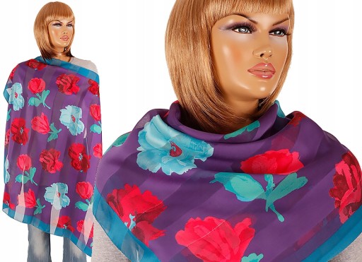 - Super kolorowa, wyrazista barwami damska chustka.Malowane kwiaty, dekoracyjne, lekko wyraźniejsze pasma.Cieńszy, miękki materiał mega podatny na modeling.Miejscowe lekkie ślady normalnego użytkowania.