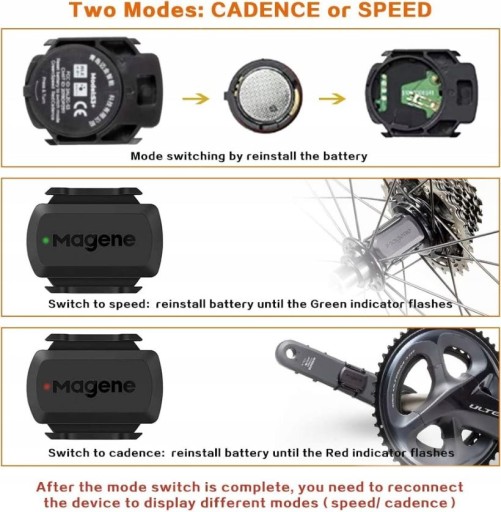 Aby przełączać między trybem prędkości i częstotliwością pedałowania wystarczy ponownie włożyć akumulator. Czujnik prędkości jest montowany na piaście koła każdego roweru, a czujnik częstotliwości pedałowania, dostarczający dokładne dane, można łatwo przymocować do ramienia korbowego roweru. Uwaga: Czujnik może wybrać tylko jeden tryb w tym samym czasie (prędkość lub częstotliwość pedałowania).