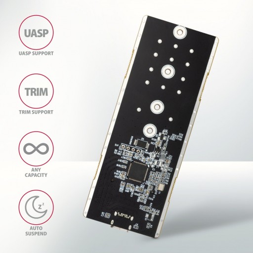 Żebrowana obudowa korpusu i podkładki przewodzące ciepło zapewniają bardzo dobre chłodzenie włożonego dysku SSD M.2. Wydłuża to jego żywotność, a także zapobiega spowalnianiu dysku, tzw. "Thermal Throttling ". Solidny korpus obudowy chroni również dysk.