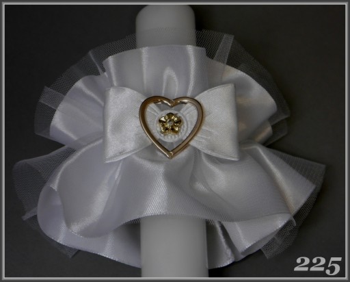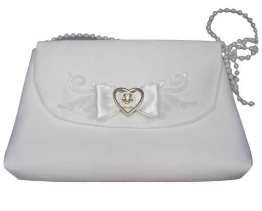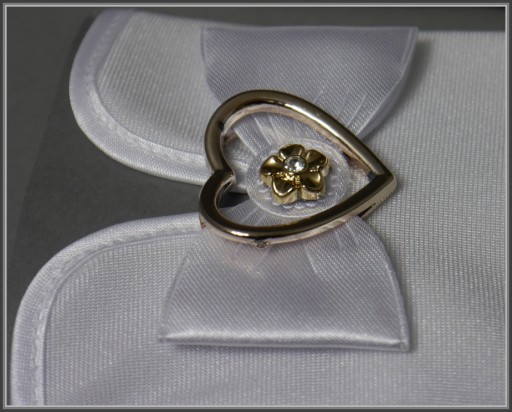 Torebka satynowa z trzech warstw tkaniny( satyna ślubna pierwszego gatunku, sztywny tiul i tkanina cambel) ozdobiona złotym serduszkiem i koronkową aplikacją. Torebka posiada sztywną wkładkę. Na pozostałych aukcjach można zakupić: Rękawiczki pięciopalczaste lub okapnik idealnie pasujące do torebki