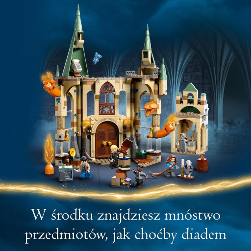 - Ciekawe szczegóły – budynek otwiera się, aby ułatwić zabawę i zawiera odczepiany pokój na piętrzedla Szarej Damy i Pokój Życzeń ze stosami elementów do zbudowania i diademem