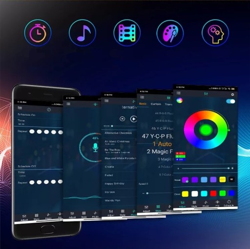 ➡️ Wbudowane sceny - w aplikacji posiadamy aż 213 różnych trybów świecenia np. świecenie opadającymi odcinkami światła różnych kolorów czy wymienianie kolorów naprzemiennie