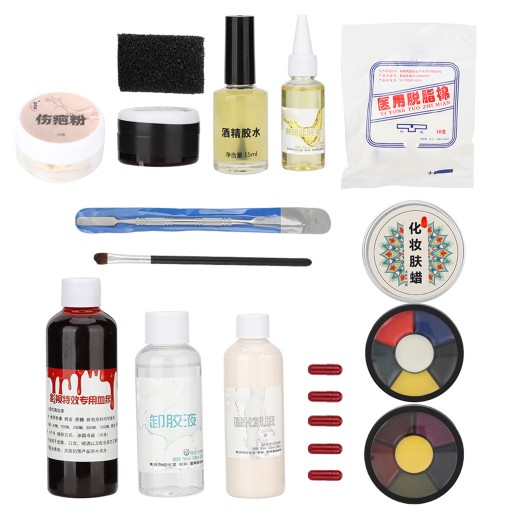 - 2 x faszywa farba na blizny 1 worek odtuszczającej baweny 1 x gąbka do robienia blizn 1 x 50 ml zmywacza do kleju 1 x 15 ml kleju 1 x 10 g proszku do tworzenia blizn 1 x 30 ml olejku przedużającego