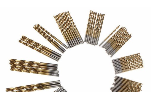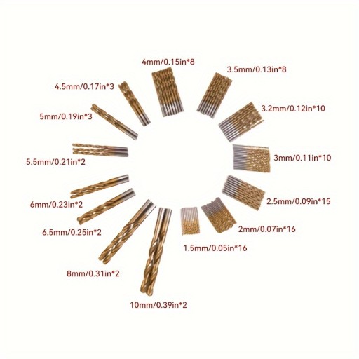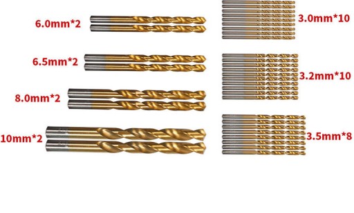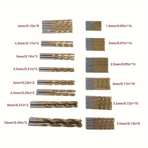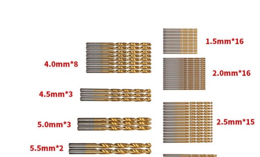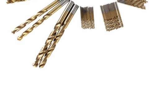 Набор из 50 сверл с прямым хвостовиком из стали с титановым покрытием.