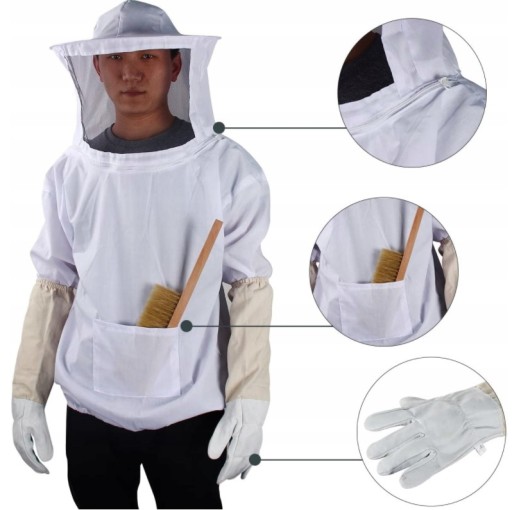 - 🍯 - W skład pakietu wchodzą: komplet ubranek pszczelarskich, rękawice pszczelarskie, szczotki i skrobaczki, które są wygodne i praktyczne.