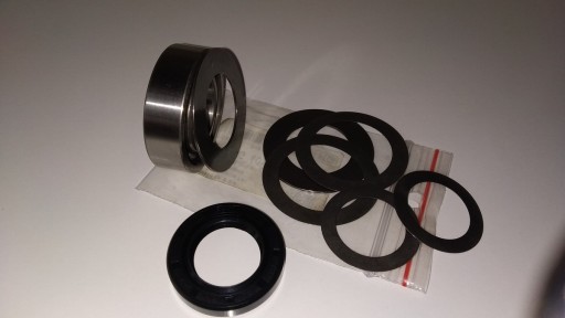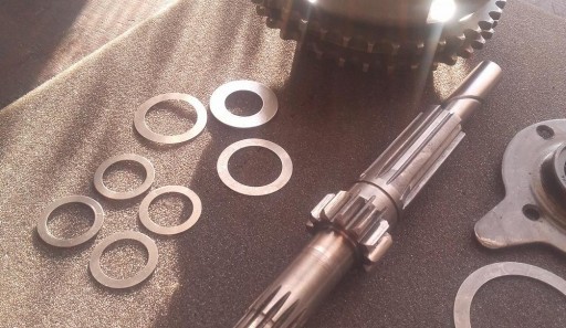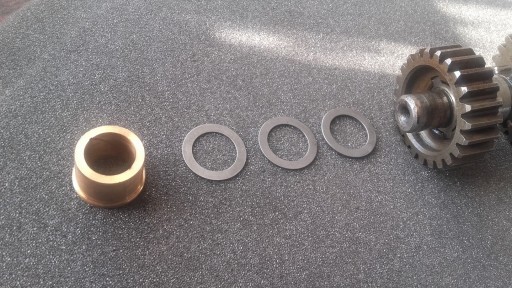 Podkładki oporowe (utwardzane) 2x15x1mm zastępują fabryczną 15x25x1,5mm i dają możliwości dystansowania bez względu na długość tulejki czy "poziom" nitowania kosza, rozwiązanie lepsze niż fabryczne. Wymagane stosowanie w parach z podkładkami mniejszymi (15 ...sama tulejka) i większymi (20 ...sam kosz). Możliwość niezależnego ustawienia kosza względem położenia tulejki pozwala na łatwe ustawianie kół zębatych wału oraz kosza w jednej linni, zalecany luz osiowy kosza 0,1-0,2mm (na sucho). Podkładki utwardzane należy zakładać w miejscach narażonych na zwiększone tarcie czyli tuż pod koszem i tuż pod zabierakiem.