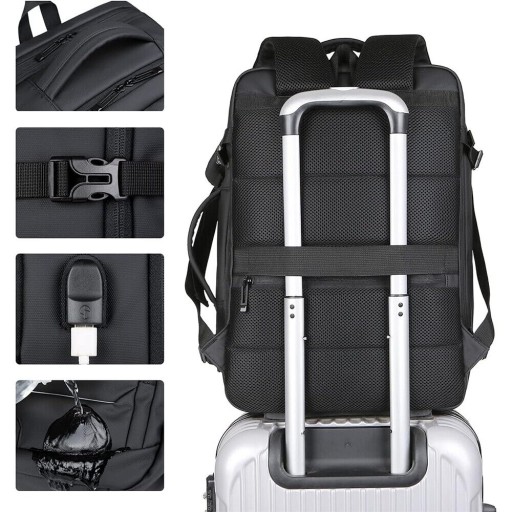 Posiada górny uchwyt do noszenia w dłoni, 2 oddychające, wygodne paski na ramiona do noszenia na ramionach. Jeśli podróżujesz z większą walizką kabinową lub bagażem podróżnym, z tyłu znajduje się specjalny pasek do mocowania bagażu, który pozwala zabezpieczyć plecak na wysuwanej rączce wózka. Uwolnij wygodnie swoje ręce!