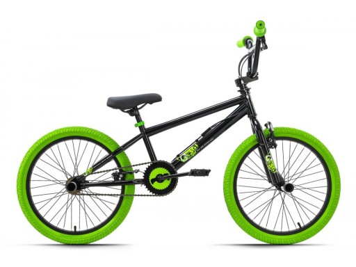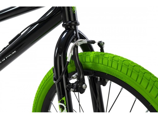G-Acid firmy KS Cycling łączy w sobie całkowicie czarną ramę z neonowymi zielonymi detalami i oponami. BMX nie tylko zachwyca swoim wyglądem, ale także solidnymi częściami, takimi jak mostek Ahead. Oczywiście rower jest wyposażony w rotor 360°, który umożliwia całkowite obrócenie kierownicy. Dwa stalowe pegi idealnie sprawdzą się do trików i tym podobnych, a hamowanie odbywa się za pomocą hamulców typu V na przednich i tylnych kołach.