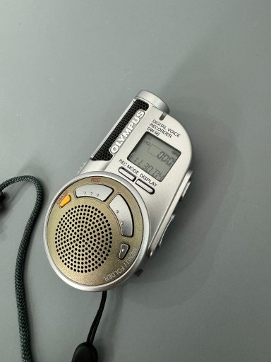 Unikatowy dyktafon Olympus, umożliwiający nagrywanie i odtwarzanie mowy lub innych dźwięków. Zasilany zwykłymi bateriami. Bardzo prosty w obsłudze, skutecznie spełnia swoją funkcję. Nietypowy i ciekawy design. Kolekcjonerski zestaw.