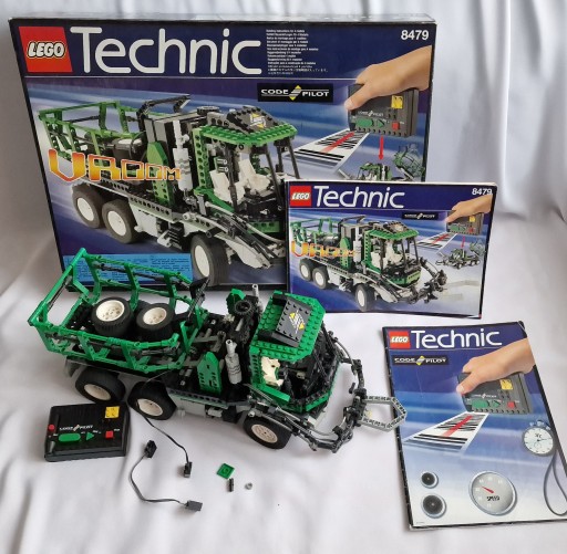 W komplecie także 3 instrukcje: do składania ciężarówki, do obsługi pilota kodów z rozpisem poszczególnych konfiguracji, oraz instrukcja z kodami. Stan bardzo dobry.