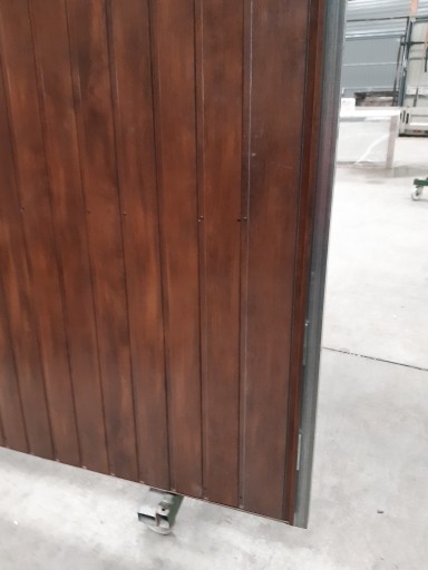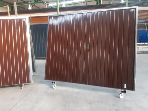 Brama garażowa niedocieplona rozwierana na zawiasach dwuskrzydłowa z symetrycznym podziałem skrzydeł w kolorze Ral : 8017 – Ci.Brąz , o wymiarach zewnętrznych 237X209 cm , do otworu montażowego o wymiarach 240x210 cm Pionowy układ poszycia trapezu T-10 . Symetryczny podział skrzydeł , jako pierwsze otwierane skrzydło Prawe patrząc z zewnątrz. Brama standardowo wyposażona jest w kpl zamek z klamką , podstawowym zestawem montażowym , podpory przeciw wiatrowe , ogranicznik otwarcia .