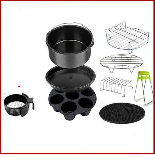 Zestaw akcesoriów do frytkownicy: w tym forma do ciasta, wiadro do ciasta, patelnia do pizzy, mata silikonowa, klips do naczyń, półka na chleb, stalowy metalowy uchwyt, stalowy metalowy stojak