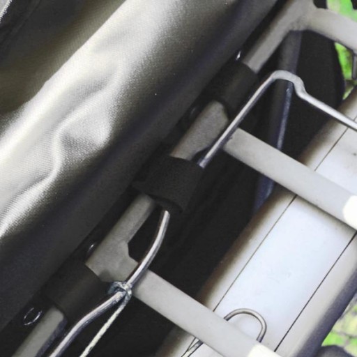 Sakwa jest zamocowana za pomocą haczyków do kabłąków bagażnika, zdjęta z nich może towarzyszyć nam w każdym spacerze dzięki dołączonemu regulowanemu paskowi.