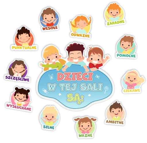 Zestaw zawiera aż 12 elementów - 1 duża wycięta tabliczka z napisem "dzieci w tej klasie są" i 11 mniejszych elementów z dziećmi oraz cechami.