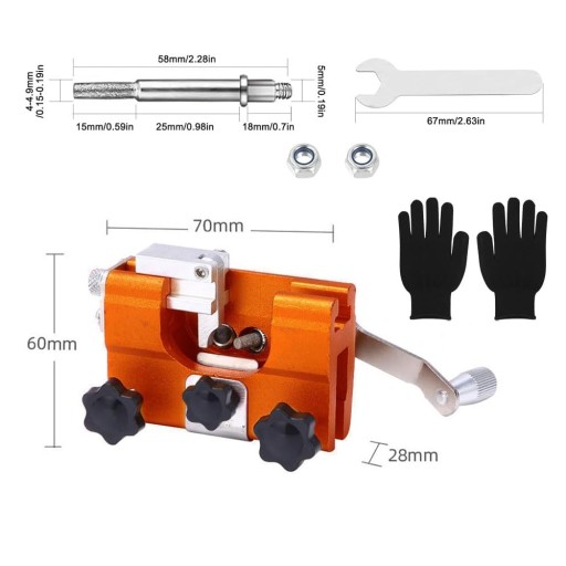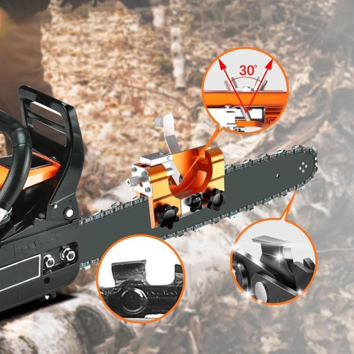 Kompatybilność z Większością Wzorów Pił Łańcuchowych: Wyposażony w 2 otwory pod kątem 30 stopni i nit mocujący, aby sprostać różnym typom łańcuchów. Ostrzałka obsługuje łańcuchy o różnych średnicach, takie jak 14"/16"/18"/20"1/4"/3/8". Dodatkowo dołączono 5 wymiennych głowic szlifierskich.