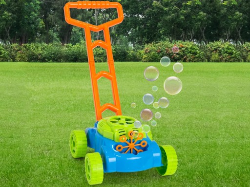 Kosiarka generująca bańki mydlane zaprojektowana jest tak, aby wygodnie jeździć po trawniku.