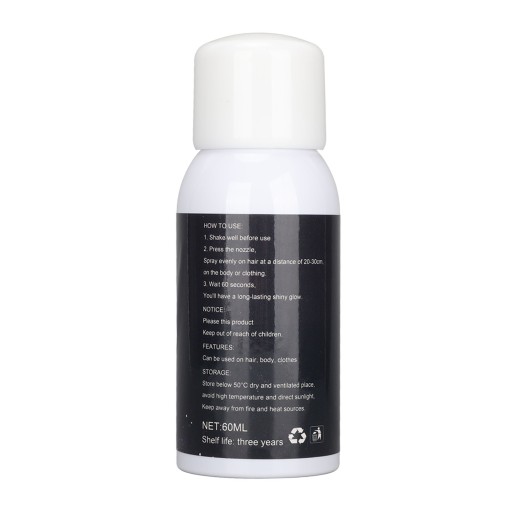 3. Równomiernie spryskaj: Przed użyciem dwukrotnie wstrząśnij, naciśnij aplikator i równomiernie spryskaj wosy, ciao lub ubranie z odlegości 20-30 cm. Efekt utrzymuje się przez 60 sekund, a Ty będziesz się byszczeć przez dugi czas.
