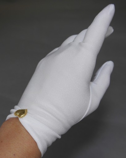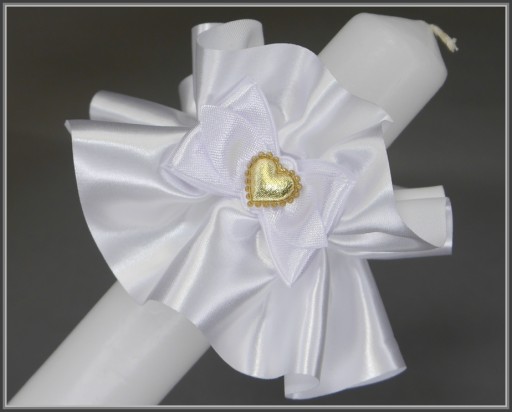 Torebka komunijna prostokątna z trzech warstw tkanin ( z satyny ślubnej pierwszego gatunku, sztywnego tiulu i usztywnianej tkaniny cambel ). Torebka ozdobiona została satynową kokardką i złotym satynowym kwiatkiem. Posiada wkładkę pomagającą w zachowaniu kształty nawet po obciążeniu. Rękawiczki pięciopalczaste i okapnik z taśmy satynowej również ozdobione kokardką i serduszkiem. Na pozostałych aukcjach dostępna jest również torebka w kształcie woreczka. Na życzenie możemy przygotować rękawiczki zakładane na jeden paluszek.