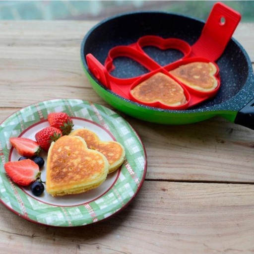 Silikonowa forma do wypieku pancakesów, smażenia jaj - przyda się każdej Pani domu. Wyposażona jest w aż 4 otwory w kształcie serduszek! Świetnie sprawdzi się w wypieku ciasteczek, jajek o określonym kształcie. Jest niezwykle elastyczna, nie wymaga dodatkowego natłuszczania i może być używana na różnych warstwach - płycie ceramicznej, granitowej czy nawet teflonie.