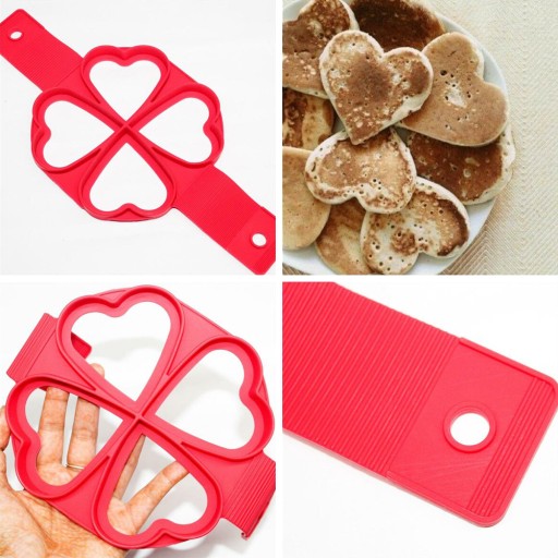 Silikonowa forma do wypieku pancakesów, smażenia jaj - przyda się każdej Pani domu. Wyposażona jest w aż 4 otwory w kształcie serduszek! Świetnie sprawdzi się w wypieku ciasteczek, jajek o określonym kształcie. Jest niezwykle elastyczna, nie wymaga dodatkowego natłuszczania i może być używana na różnych warstwach - płycie ceramicznej, granitowej czy nawet teflonie.