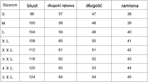 UWAGA! Podane rozmiary mogą różnić się od standardowych, przy wybieraniu nie kieruj się tym jaki rozmiar zwykle nosisz. Żeby prawidłowo dobrać rozmiar, zmierz swoją odzież i porównaj z wymiarami podanymi w aukcji. (tolerancja wymiarowa /- 2cm).
