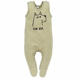 Wygodne śpiochy niemowlęce w przewodnim kolorze kolekcji – przepięknej zieleni z nadrukiem zabawnego pieska z przodu oraz napisem „FUN DEP.”. Do nadruku zastosowaliśmy sprawdzoną metodę farb wodnych. To sprawia, że kolory na naszych nadrukach są trwałe, nawet po wielu praniach. Specjalne gumki nad piętkami uniemożliwiają zsuwanie się ich podczas codziennych aktywności. Śpioszki rozpinane są na ramionkach i w kroku. Wszystkie zatrzaski wykonano z antyalergicznego tworzywa bez dodatku niklu. Wszyty w kroku klin zapewnia dziecku komfort noszenia. Nasze śpiochy zostały wyprodukowane w Polsce, posiadają certyfikat „Bezpieczny dla dziecka” i będą świetnie wyglądać z kaftanikiem lub body z tej samej kolekcji. Jest to niezbędny element wyprawki dla niemowlaka.
